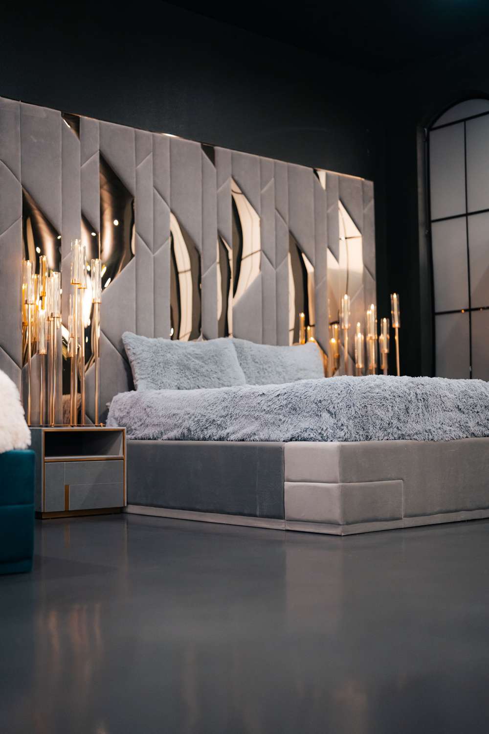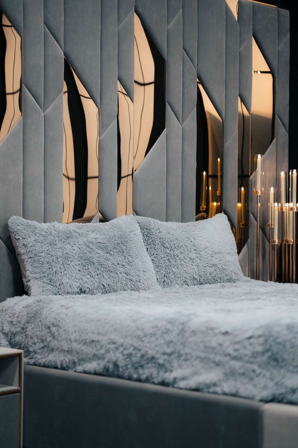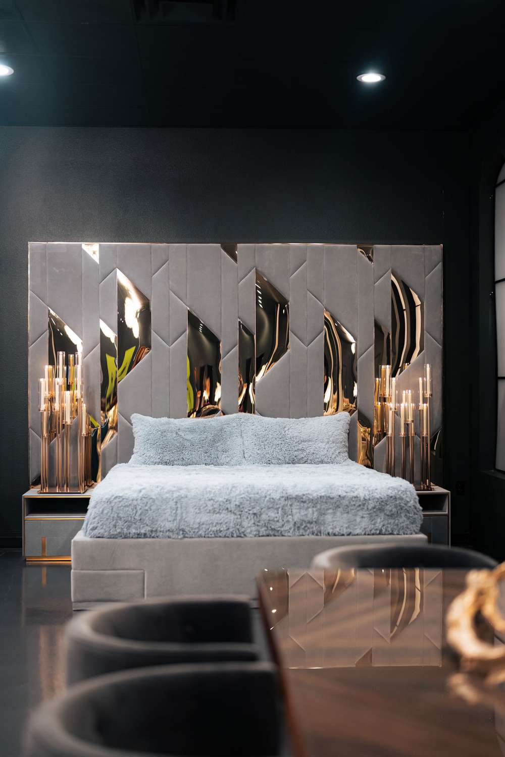 A show stopping bedroom set with an exceptionally tall headboard resembling a skyscraper, featuring a scattering of glistening mirrors, beautiful velvet upholstery.